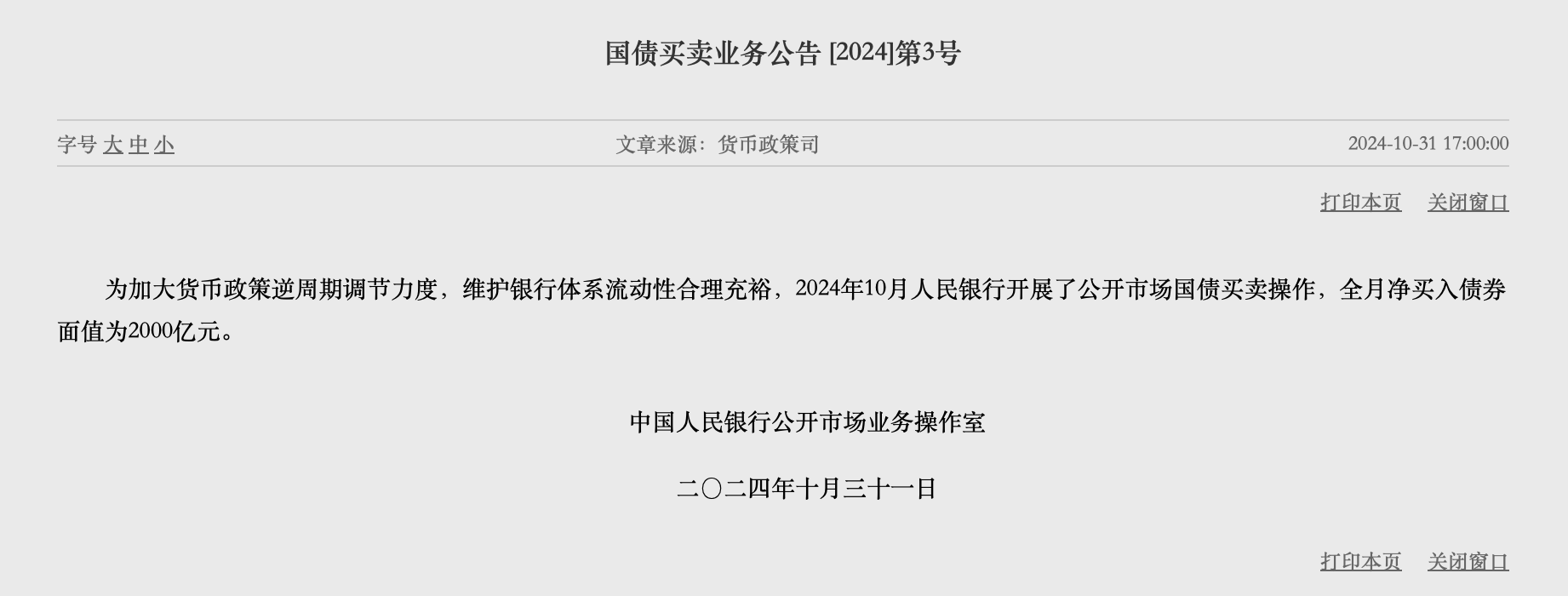 除了开展买断式逆回购操作5000亿元,今天的另一则公告深化,央行本月国债净买入2000亿元。